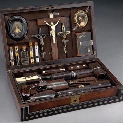 Back at Mooney’s Saloon, a thrilled lackey under Amelia’s sway presents a mysterious suitcase found near the edge of town. Inside is a well-preserved vampire hunter’s kit: wooden stakes, silver instruments, crosses, garlic oil, vials of holy water, and even tools for exorcism.